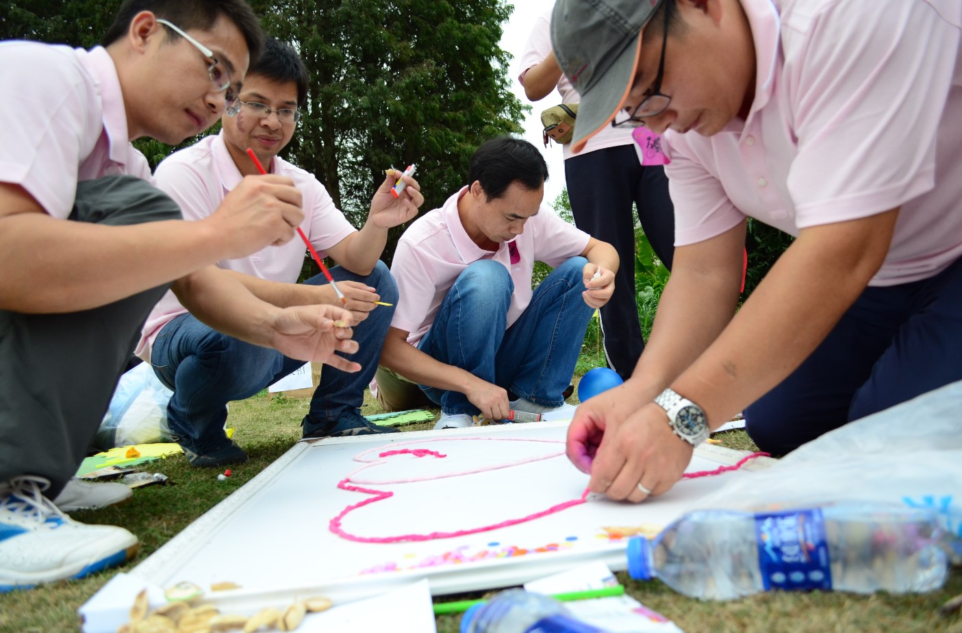 在培訓(xùn)師的指導(dǎo)下,我們抽簽隨機分成了12支以十二生肖命名的團隊,進行了各式各樣生動有趣的團隊競技游戲,包括“一氣呵成”、“大家比劃我來猜”、“瘋狂連連看”……這些游戲讓大家通過親近的身體接觸,由此而自發(fā)交談,有了更多了解彼此的機會,拉進了每位隊員間的距離。在游戲開始前,我們需要充分發(fā)掘團隊的每一個隊員身上的閃光點,傾聽及采納每一個隊員提出意見和建議,合理有序的安排各項任務(wù),凝聚團隊內(nèi)每一位成員的智慧,充分發(fā)揮了每一個隊員的潛力,齊心協(xié)力,相互配合。在游戲過程中,友好競爭時的爭強好勝,丑態(tài)百出時的會心一笑等等,都是大家關(guān)系在逐步融合的契機。游戲結(jié)束后,大家已經(jīng)可以彼此之間互開玩笑,主動交談了,所以不得不不承認,這些游戲真的是大家友誼的潤滑劑。